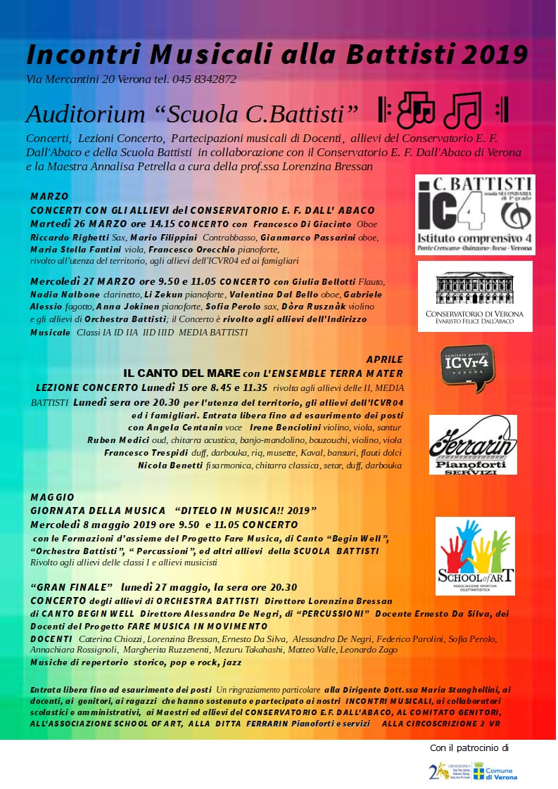 Stasera, 15 aprile, alle 20.30, presso la scuola Battisti, si svolge il Concerto IL CANTO DEL MARE con L’ENSEMBLE TERRA MATER. E’ un evento nell’ambito degli incontri musicali organizzati dalla prof.ssa Lorenzina Bressan.